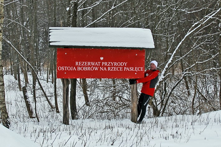 Z początku biegło mi się świetnie. Ale zdecydowanie za szybko ! Jednak musiałem się rozgrzać szybszym biegiem, gdyż wcześniej bardzo wymarzłem przy udzielaniu tych wszystkich wywiadów oraz kręceniu zdjęć. Droga – wszędzie biały asfalt. I wąsko ! Grzesiek, jadący samochodem bał się, żeby nie zjechać do rowu, bo pobocza były całkowicie zaśnieżone. Nie padało, wiatr był słaby, ale czułem zimno na twarzy (znowu zapomniałem posmarować się kremem !). Za miejscowością Unieszewo wjechaliśmy do lasu. No i się zaczęło ! Śniegu było tyle, że nasz samochód jechał przodem, żeby zostawić mi wąskie koleiny, którymi biegłem ślizgając się niemiłosiernie, bo pod spodem był lód. Moje „salomonowe” mantry (buty) robiły, co mogły, ale w takich warunkach mogły pomóc tylko buty z kolcami. Ale kto wiedział, że takie będą jeszcze w ogóle potrzebne w pierwszy dzień kalendarzowej wiosny !