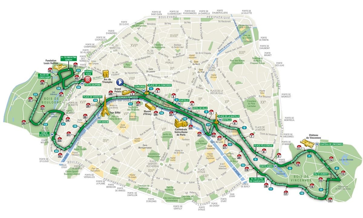 Na trasie maratonu poza wspaniałymi bulwarami oraz zabytkami znajdują się także dwa duże kompleksy leśne – Bois de Vincennes (9 – 18 km biegu) oraz Bois de Boulogne (34 – 41 km), z których zwłaszcza ten ostatni daje solidnie w kość. Niestety trasa paryskiego maratonu nie jest płaska lecz dosyć pofalowana. Lekko wznosi się od 8-go do 18-go kilometra (ww. las Vincennes), po czym nieco opada, by znowu zacząć się wznosić od 30-go kilometra, aż prawie do samej mety. To sprawia, że rekordy świata tutaj nie padają (jak w Londynie i Berlinie…), ale atmosfera biegu jest naprawdę wspaniała. Ogromne wrażenie robi zwłaszcza start biegu na Polach Elizejskich, gdzie oczekuje kilkadziesiąt tysięcy biegaczy oraz drugie tyle kibiców. Trochę zastrzeżeń można mieć do usytuowania samej mety w dość mało eksponowanym miejscu na bulwarze Focha. Oczywiście marzeniem startujących w Paryżu maratończyków byłaby z pewnością meta biegu ulokowana w Łuku Triumfalnym na rondzie generała de Gaulla (Charles de Gaulle – Etoile), ale to chyba nie będzie możliwe z powodów komunikacyjnych. Pod tym względem, maraton w Paryżu wypada nieco słabiej niż Berlin, Londyn, czy Nowy Jork, gdzie tamtejsze maratony kończą się bardziej spektakularnie. W Paryżu jest też dużo mniej kibiców na trasie, zwłaszcza na obu, długich odcinkach leśnych. Niemniej paryski maraton, który prawie zawsze jest rozgrywany w pierwszej połowie kwietnia jest wart polecenia każdemu, kto po dobrze przepracowanej, biegowej zimie chciałby się sprawdzić na królewskim dystansie. Tylko musi mieć zaświadczenie od lekarza, że może stanąć na starcie maratonu, czego organizatorzy bardzo skrupulatnie pilnują i nikomu nie przyznają numeru startowego bez „Health Prevention Course”.