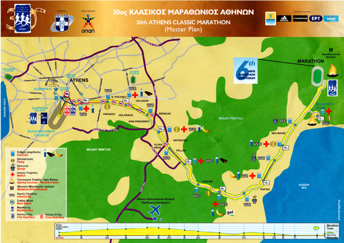 Co prawda pierwsze 10 km trasy jest płaskie i ciągnie się wzdłuż morskiego wybrzeża, to zaraz potem rozpoczyna się długi, bo aż 21-kilometrowy odcinek z licznymi i męczącymi podbiegami na wzniesienia okalające Ateny, w tym m.in. górę Penteli (gr. Vrillisos), słynnej z pokładów białego marmuru, którego użyto onegdaj do budowy ateńskiego Akropolu. Dopiero od 32 km dystansu rozpoczyna się łagodny zbieg w dół. Z uwagi właśnie na tak wymagający profil trasy, maraton ateński uważany jest przez trenerów, samych biegaczy oraz statystyków długodystansowych biegów za jeden z najtrudniejszych, klasycznych maratonów na świecie. To właśnie między innymi dlatego, rekord tej historycznej trasy (2:10:55) ustanowiony w 2004 roku podczas Igrzysk Olimpijskich w Atenach przez włoskiego biegacza Stefano Baldiniego jest wyraźnie gorszy od uzyskiwanych aktualnie wyników na tym dystansie, w tym ustanowionego niedawno rekordu świata w maratonie mężczyzn (2:01:39). Wspomniane, olimpijskie zwycięstwo Włocha w maratonie, świat – nie tylko sportowy – zapamiętał jeszcze z powodu niecodziennego wydarzenia do jakiego doszło na historycznej trasie biegu, kiedy w okolicy 40 km jeden z kibiców zaatakował prowadzącego stawkę biegaczy, Brazylijczyka Vanderlei’a de Lima, co pozbawiło go praktycznie szans zdobycia złotego medalu olimpijskiego (ostatecznie zdobył brązowy).