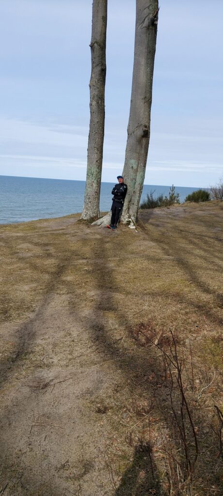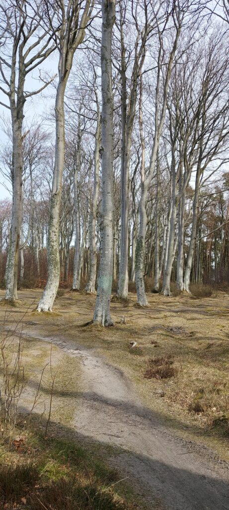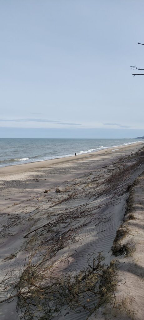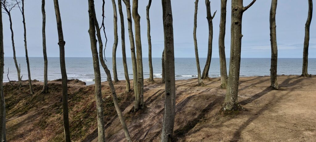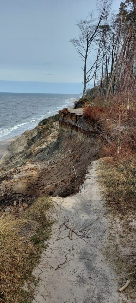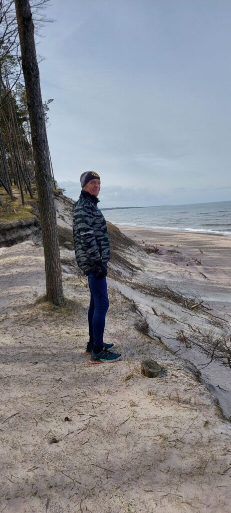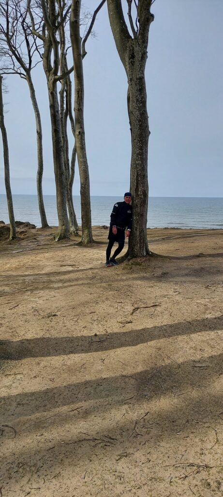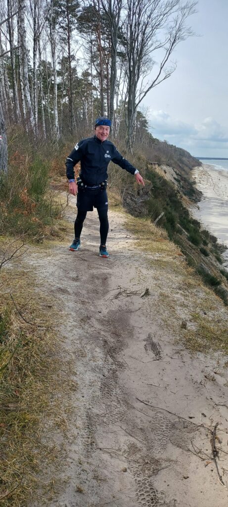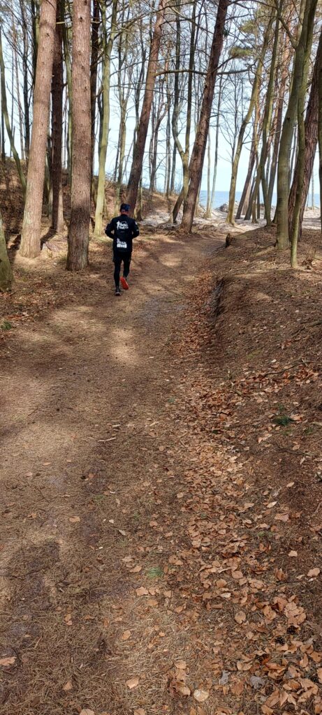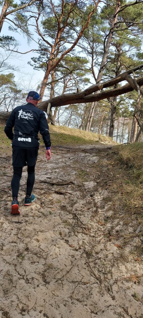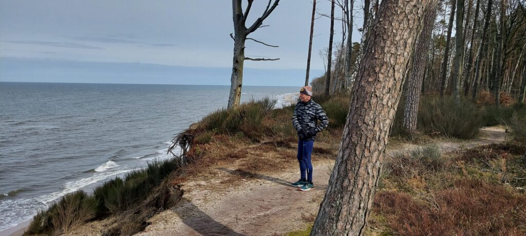 Zaczęliśmy z Januszem zgodnie z planem, spod latami morskiej w Ustce skąd po 2-kilometrowym odcinku miejscową promenadą wbiegliśmy do lasu. No i się zaczęło… Podbiegi i zbiegi, przewrócone drzewa i wystające korzenie, twardy dukt leśny i odcinki mocno piaszczyste, gdyż biegliśmy skrajem lasu tuż przy morskim brzegu. Kilka razy się też zgubiliśmy, gdyż oznaczenie szlaku nie było najlepsze i musieliśmy zawracać. W rezultacie, po 10 km biegu czuliśmy się tak, jakbyśmy zrobili już drugie tyle po asfalcie. W dodatku nasza organizacyjna baza, czyli „Radosna Toyotka” nie mogła nam dzisiaj towarzyszyć, bo prawie wszędzie spotykała zakaz wjazdu. Mimo to sunęliśmy dzielnie do przodu, choć wokół nie było widać żywego ducha. Żadnych ludzi, żadnych zabudowań, ani nawet typowo ludzkich śladów, czyli…śmieci. Wszędzie dzika i wspaniała natura ograniczona tylko bezmiarem fal Bałtyku oraz niebem nad nami. Jak dość szybko zauważyłem, biegliśmy najczęściej przez bardzo stary bukowy las. W pewnym jednak momencie, ścieżka którą podążaliśmy nagle się…skończyła, gdyż wysoki klif po którym prowadziła po prostu się osunął kilkanaście metrów w dół. Znowu musieliśmy nadłożyć drogi, która jednak potem zaprowadziła nas w takie miejsca, że nam dech zaparło z wrażenia. Nawet nie przypuszczałem, że na polskim wybrzeżu Bałtyku istnieją jeszcze tak piękne i tak dzikie miejsca jak te, które dzisiaj z zobaczyliśmy (polecam filmiki z dzisiejszej relacji). W każdym razie, fragment polskiego wybrzeża pomiędzy Ustką, a miejscowością Rowy uważam za absolutnie najpiękniejszy na pokonanej dotąd trasie Baltic Tour 2022! Mega wielkie hotele i apartamentowce dla bogaczy jeszcze tu nie dotarły, choć ich forpoczty tutaj również już są… Ale póki co, szczęście mi dzisiaj dopisało, gdyż zobaczyłem młodego orła bielika, jak kołował sobie majestatycznie nad nami. Widok bezcenny!