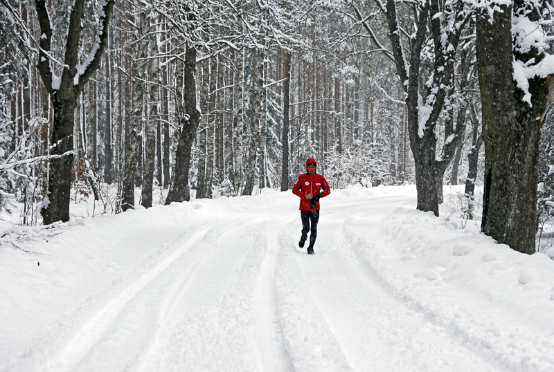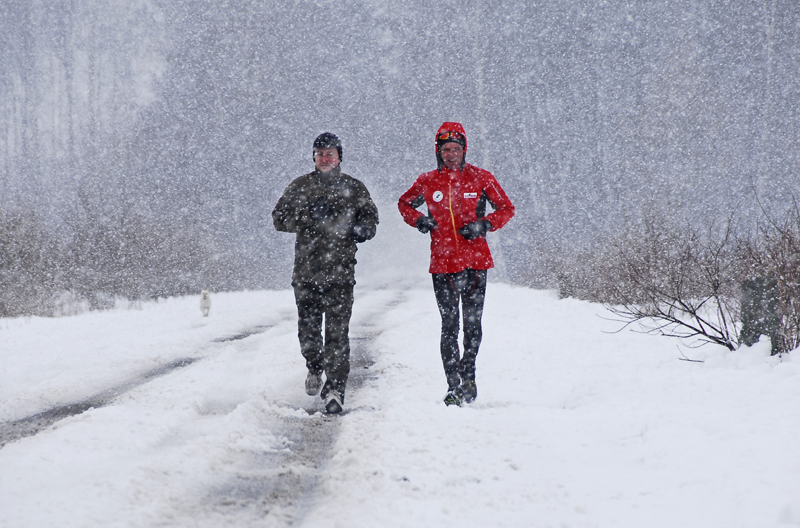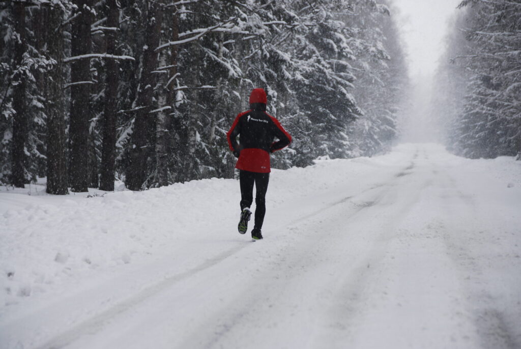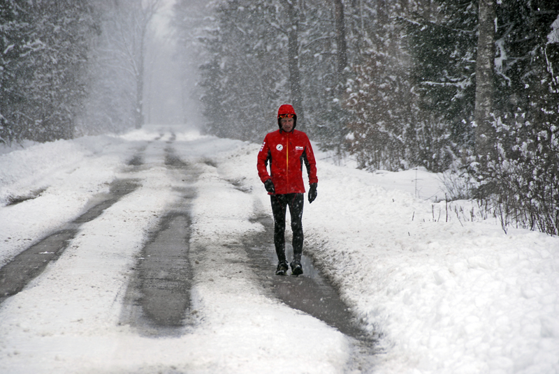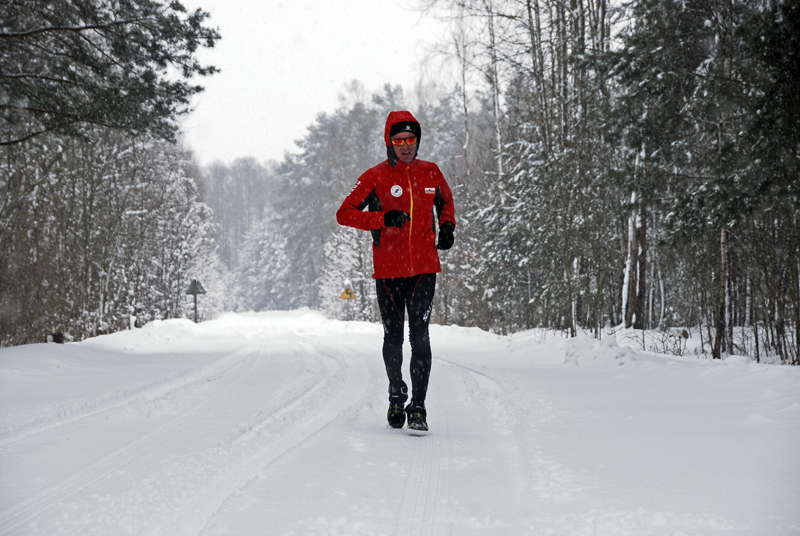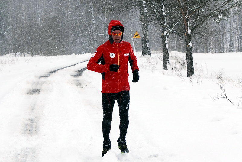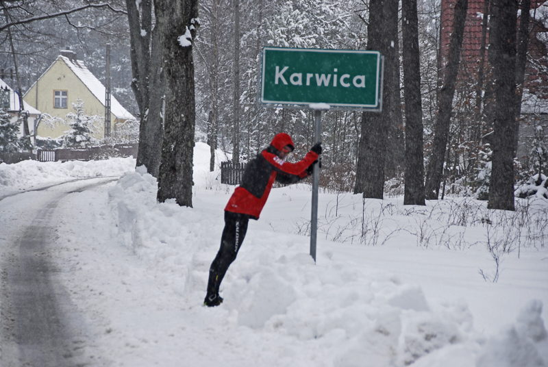 Dzisiejszy etap zaczął się nieciekawie nie tylko z powodu fatalnej pogody (śnieg i wiatr), ale także z powodu wczorajszej kontuzji lewej nogi. Wprawdzie wieczorem intensywnie wcierałem zabrane ze sobą maści oraz własnoręcznie „zatejpowałem” sobie bolące miejsce taśmą-plastrem Kinesio, ale dzisiaj, gdy tylko ruszyłem bolało już tak, że ten wczorajszy ból to była… bułka z masłem. Cały czas kuśtykałem, a każde uderzenie lewej stopy o asfalt ten ból tylko wzmagało. Szybko też zauważyłem, że jak biegnę po śniegu to boli trochę mniej, więc podążałem skrajem drogi, taplając się co chwila w pośniegowym błocie. Mimo nałożonych ochraniaczy, już po kilku kilometrach miałem mokro butach. Nie miało znaczenia, czy biegnę szybko, czy wolno – bolało tak samo. Wreszcie, po piątym kilometrze nie wytrzymałem i wziąłem środek przeciwbólowy i posłucham rady Grześka, który kazał mi biec lewą stopą bardziej na śródstopiu, nie używając pięty. Trochę pomogło, a może to zadziałał wspomniany środek. Niemniej zauważyłem również, że najgorzej bolało gdy przestawałem biec i ruszałem ponownie, gdy natomiast biegłem bez zatrzymywania to po pewnym czasie ból się nieco zmniejszał. Postanowiłem w związku z tym, że skoro ten ból nie dał się wczoraj, ani dzisiaj…”wypuścić uszami”, to go po prostu zabiegam ! Jak zresztą czyni wielu biegaczy, choć czasem później tego mocno żałują. Wrzuciłem więc drugi bieg i w miarę szybko – jak na dzisiejsze warunki atmosferyczne – pokonałem kolejne 5 km. Pomagało, że starałem się biec cały czas po śniegu, który amortyzował uderzenia. Niestety, w miejscowości Rozogi (siedziba tutejszej gminy) wbiegłem na czarny asfalt i od razu „zatęskniłem” do tego… w kolorze białym, który na szczęście znowu się pojawił tuż za Rozogami. Zajęty ciągłą walką z bólem lewej nogi, nie zwracałem zbytniej uwagi, ani na wciąż padający śnieg, ani na obryzgujące mnie błotem samochody (i tak już miałem mokre buty !), ani na tempo w jakim biegłem. Tak dobrnąłem do połowy dzisiejszego etapu, gdzie dołączył do mnie Macek z Nadleśnictwa Spychowo, mój towarzysz na wczorajszym etapie. Dzięki rozmowie w trakcie biegu, mogłem odwrócić swoją uwagę od bolącej nogi. Szkoda, że nie mógł nam towarzyszyć również Adam, ale podobno jego pies – rasy husky miał dzisiaj zakwasy po naszym wczorajszym biegu :). Maciek dobiegł ze mną, aż do samej granicy Nadleśnictwa Spychowo, które dało nam również dodatkową eskortę w postaci dwóch samochodów, które nie pozwoliły nam zabłądzić na tutejszych drogach…trzeciej kolejności odśnieżania. Dalej zaczynał się już obszar zarządzany przez Dyrekcję Lasów Państwowych z Białegostoku. W ten sposób, opuściliśmy bardzo gościnne dla nas miejsca olsztyńskich leśników i rozpoczęła się „podlaska” część Mazury Tour 2013. Mamy nadzieję, że będzie równie udana. Wkrótce też, mało ciekawy – polny krajobraz Mazur zaczął się powoli zmieniać.