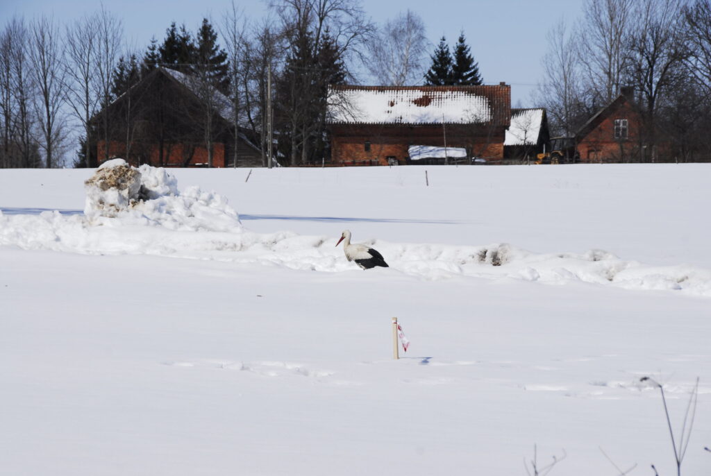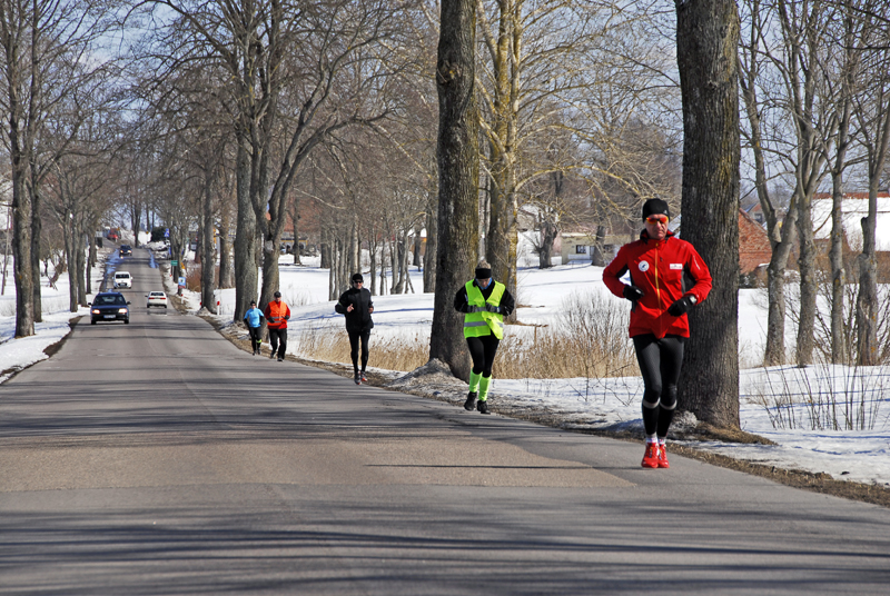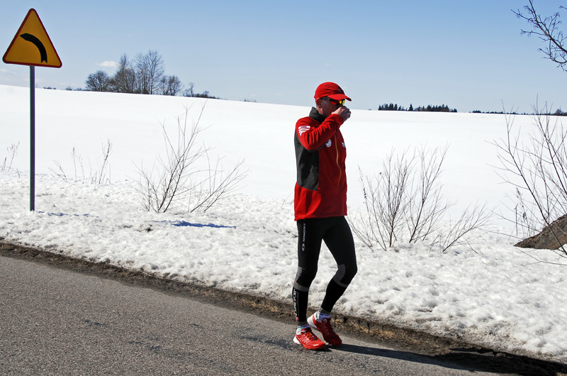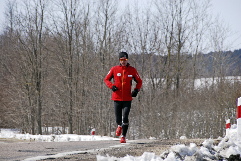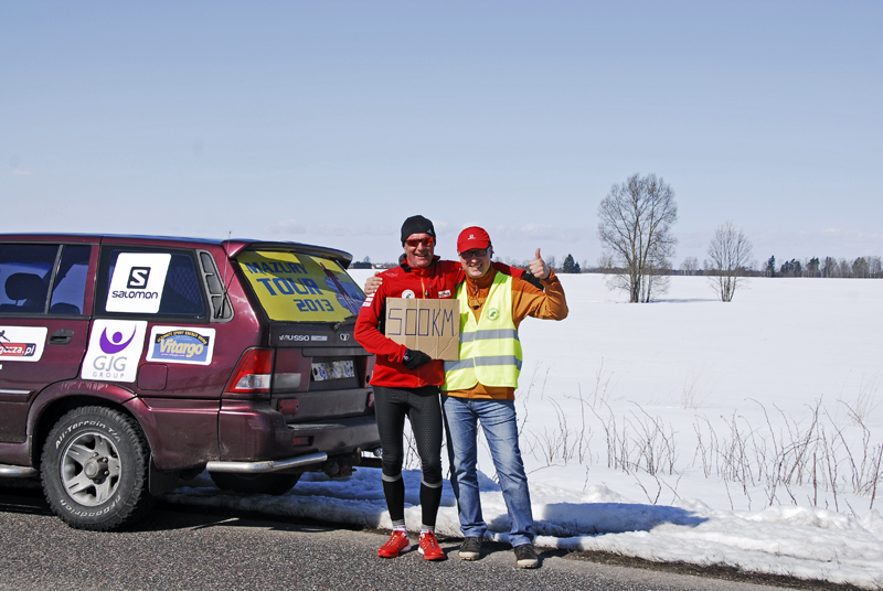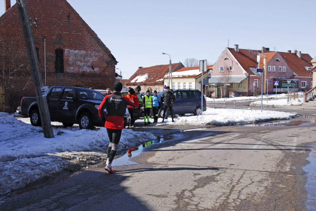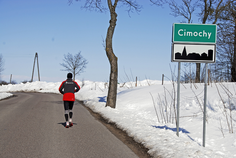 Już od pierwszego kilometra czułem, że coś jest dzisiaj nie tak. Było mi niedobrze. Gdy po 5-tym kilometrze zjadłem żel, to chciało mi się zwymiotować. O jedzeniu batona, czekolady, albo czegokolwiek innego nie było w ogóle mowy. Jedyne co mogłem, to pić ciepłą herbatę z termosa, którą przygotował Grzesiek. Gdy tylko na mnie spojrzał rano podsumował krótko: „Oj wyglądasz jakoś nieciekawie…” Wiedziałem o tym, bo biegło mi się naprawdę ciężko. Także dlatego, że nie mogłem dojść do ładu z pogodą i moim ubraniem – raz było mi za ciepło, więc zdjąłem rękawiczki i zmieniłem czapkę, na taką z daszkiem. Myślałem nawet przez chwilę, żeby zdjąć kurtkę, ale na szczęście tego nie zrobiłem, gdyż wkrótce (mimo słońca) zaczęło solidnie wiać i nie były to ciepłe powiewy nadchodzącej wiosny, a raczej lodowate „liźnięcia” wciąż panującej tutaj zimy. Tak więc, szybko założyłem z powrotem rękawiczki oraz cieplejszą czapkę. Nie mogłem biec takim tempem jak chciałem, więc kilometry wlokły się niemiłosiernie. A odliczałem dzisiaj każdy kolejny, jak nigdy, bo gdzieś za miejscowością Cimochy miał przypaść kilometr numer 500, który pokonałem od początku „Mazury Tour 2013″.