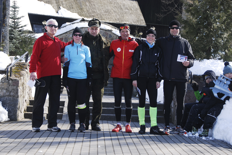 Ale jeszcze w Cimochach spotkała mnie bardzo miła niespodzianka w postaci czekającej tam na mnie kilkuosobowej ekipy biegaczy z Olecka oraz dwóch reprezentantów tutejszego Nadleśnictwa Olecko. Mieliśmy pobiec wspólnie do Wieliczek, gdzie była meta dzisiejszego etapu Ale wcześniej, na drodze w szczerym polu, gdzieś za wspomnianymi Cimochami pokonałem 500-tny kilometr „Mazury Tour 2013”, co uczciliśmy jedynie pamiątkowymi zdjęciami. Niestety „grześkowa” herbata już się skończyła, a ja nie chciałem pić, ani jeść czegokolwiek innego. Gdy dobiegliśmy do Wieliczek byłem naprawdę wycieńczony brakiem jedzenia oraz izotonicznego picia na trasie.