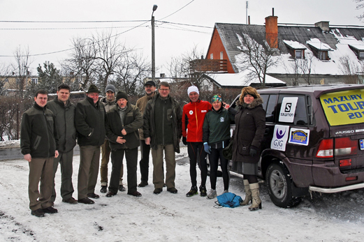 Zaczęło się bardzo przyjemnie, bo… w Ameryce, gdzie powitała nas liczna grupa leśników z Nadleśnictwa Olsztynek, których reprezentanka Pani Danuta Mikielska, jako pierwsza osoba na trasie wyprawy biegowej „Mazury Tour 2013” miała mi towarzyszyć na pierwszych kilkunastu kilometrach dzisiejszego etapu. Było mnóstwo śmiechu oraz pamiątkowych zdjęć, po czym zgodnie z planem, o 11:30 ruszyliśmy. Po kilku kilometrach wbiegliśmy do Olsztynka, gdzie najpierw powitał nas szpaler leśników tutejszego nadleśnictwa z flagą i oklaskami, a na końcu miasta spotkała nas kolejna niespodzianka, w postaci wspaniałego powitania pracowników sąsiedniego Nadleśnictwa Jagiełek. Niektórzy z nich, nawet z nami kawałek przebiegli !