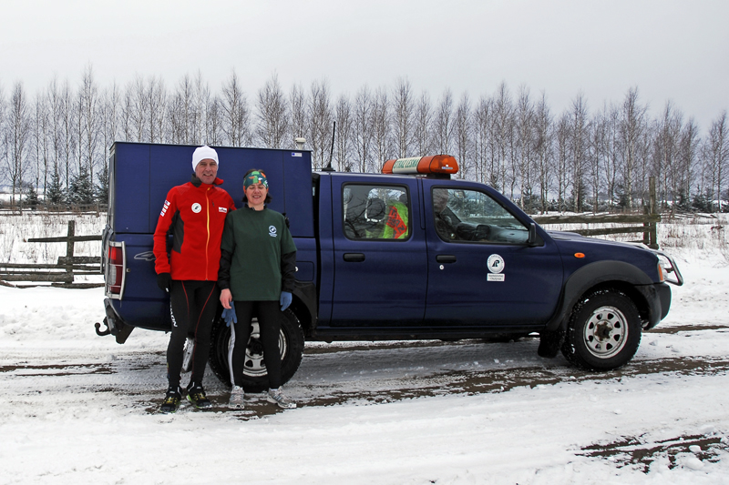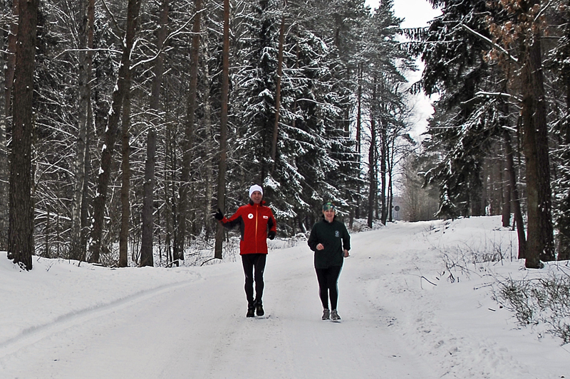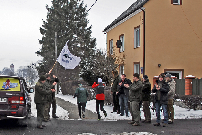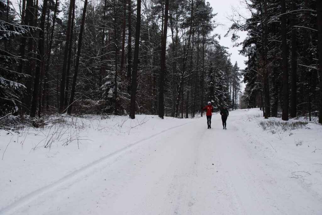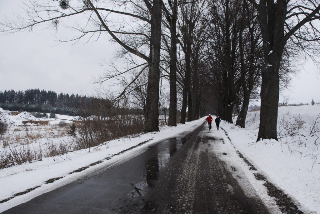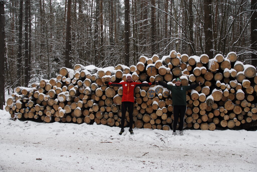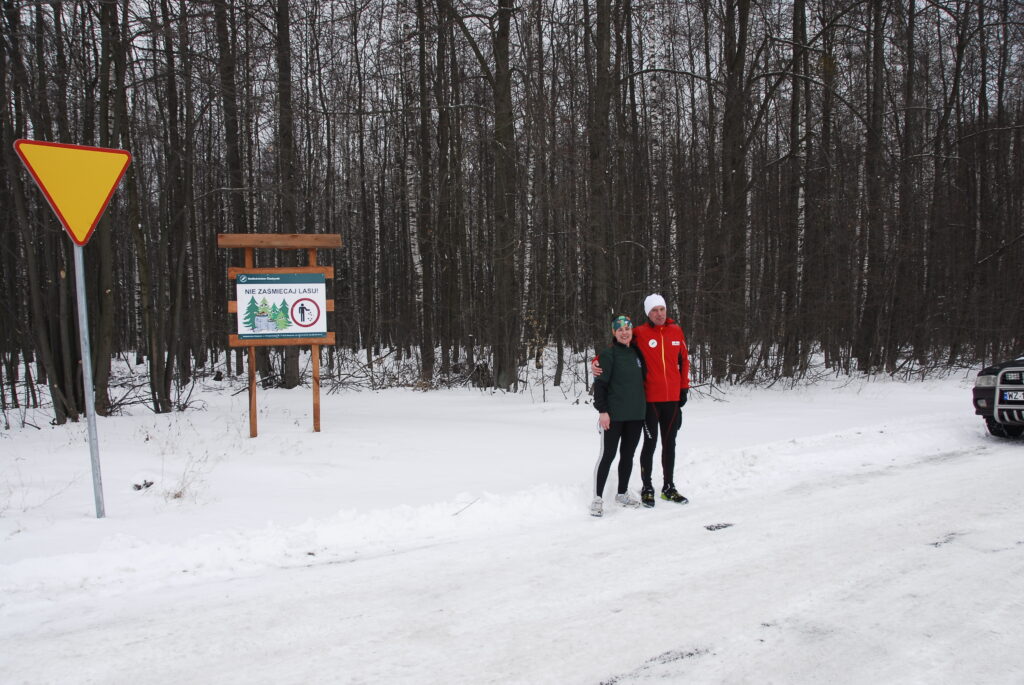 W trakcie biegu, Pani Danuta opowiadała mi o pracy leśników w ogóle, o Nadleśnictwie Olsztynek, o samym Olsztynku oraz o swojej pasji biegowej, czyli biegach na orientację. Kolejne kilometry mijały nam bardzo szybko i po pierwszych, asfaltowych kilometrach, za miejscowością Lichtajny wbiegliśmy do lasu. Naprawdę pięknego ! 🙂 Ośnieżone, iglaste drzewa po obu stronach leśnego duktu, który był pokryty śniegiem, choć mimo to był dosyć twardy. Tylko miejscami, moje stopy ślizgały się po tym lodzie. Ale nie tak jak wczoraj, na pierwszym etapie. Na koniec wspólnego biegu odwiedziliśmy szkółkę leśną, gdzie czekali na nas jej gościnni pracownicy. Niestety, trzeba było biec dalej. Dalej – czyli już po 13 km – pobiegłem już sam. Asfaltową szosą w kierunku na Lubawę. Tam już biegło mi się miejscami naprawdę super, choć trochę przerażały mnie pędzące non-stop TIR-y. Trochę też sam nieco hamowałem, bo postanowiłem że dzisiaj pobiegnę wolniej niż wczoraj, w czego efekcie dystans półmaratonu (21,1 km) pokonałem kilka minut wolniej niż dzień wcześniej (dokładnie w czasie 2:01 godz.)