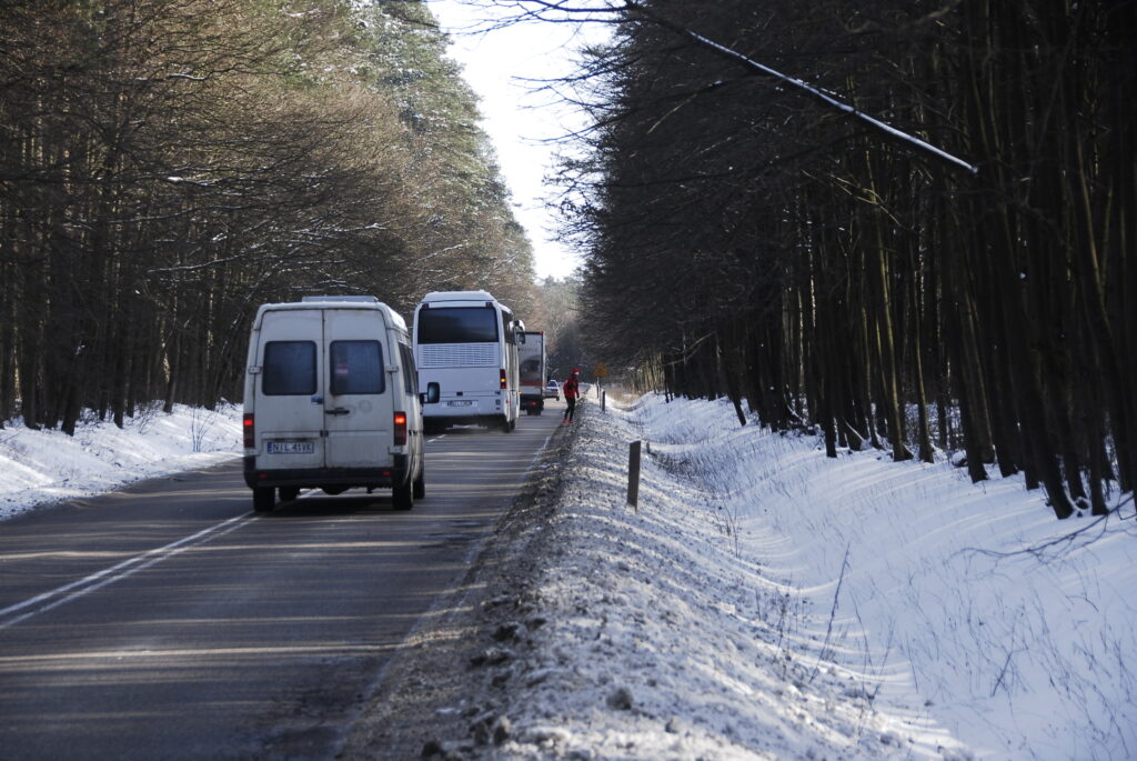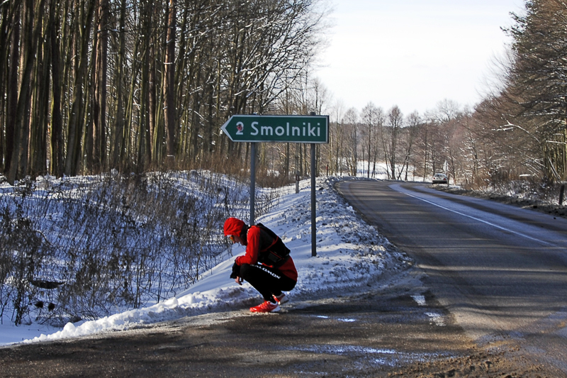 Dopiero w samochodzie, gdy jechaliśmy na miejsce startu przeczytałem sms-a, że w Ostródzie jest minus 9 stopni mrozu (w końcu marca !). Ale co tam, nie raz przyszło mi biegać w takiej temperaturze – pomyślałem i punktualnie o 11-tej ruszyliśmy. Tuż za Frygnowem zaczęły się rozległe pola i wtedy dopiero poczułem, jak jest makabrycznie zimno !