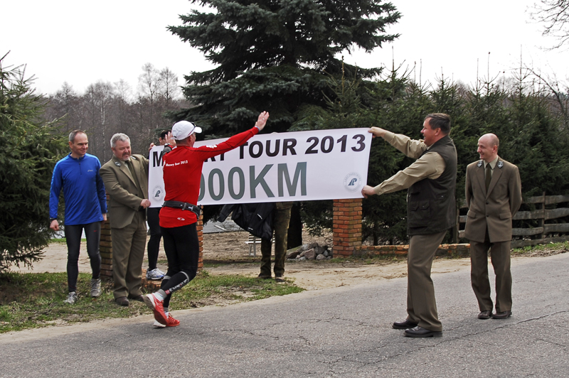 Zanim jednak dotarliśmy do wspomnianego Jerzwałdu, ruszyliśmy z Jackiem spod samego Zalewa (czyli tam, gdzie wczoraj skończyłem) mając za głównego przeciwnika wiatr, który wiał nam prosto w twarz, chwilami bardzo mocno (jak pokazał później mój Garmin, w porywach nawet do 30 km/h !). Męczyliśmy się okrutnie, to znaczy głównie ja zdecydowanie bardziej, bo ważę obecnie znacznie mniej niż Jacek i miotało mną straszliwie. Mimo to, bardzo mile rozmawiając sunęliśmy sprawnie do przodu. Byle do Jerzwałdu! – wówczas pomyślałem, gdyż tam zaczynają się „SUSZ-owe” lasy, gdzie powinno już wiać zdecydowanie słabiej. Poza tym wiedziałem, że tam już będą na nas czekać… 😊 Gdyż w właśnie w Jerzwałdzie przypadał 900-tny kilometr mojej wyprawy biegowej. Jak ja to w ogóle zrobiłem ?! Z tą wiedzą, którą teraz posiadam, nie wiem czy drugi raz porwałbym się na coś takiego… W Jerzwałdzie, rzeczywiście na nas czekali, przedstawiciele obu sąsiadujących ze sobą nadleśnictw, czyli Dobrocina i Susza. Ci pierwsi przygotowali nawet, wspaniały transparent upamiętniający pokonanie przeze mnie, 900-go kilometra „Mazury Tour 2013″! 😊