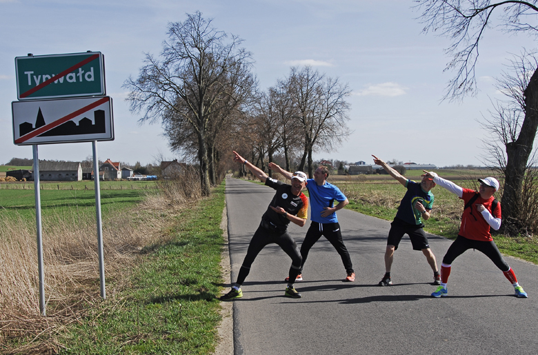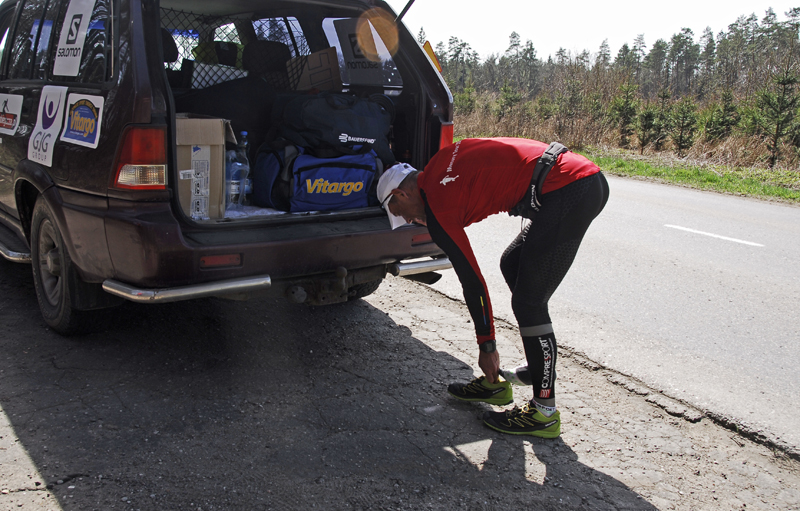 Tak sobie gawędząc, podziwialiśmy mocno zalesiony lewy brzeg Jezioraka, gdzie nie było praktycznie żadnych miejscowości, tylko sam dziewiczy las. Aż żal nam było opuszczać tereny wspomnianego wcześniej Parku Krajobrazowego Pojezierza Iławskiego. Niestety trzeba było nie tylko je opuścić, ale wybiec w dodatku na bardzo ruchliwą i wąską szosę z Iławy na Kwidzyń, którą już jednak dobrze znałem, bo biegłem tamtędy…32 dni temu (Boże, jak to już było dawno !). Po kilku kilometrach tej drogi zdecydowałem się na zmianę butów na salomonowe mantry, z uwagi na ich większą amortyzację, bo lewa noga dokuczała mi coraz bardziej.