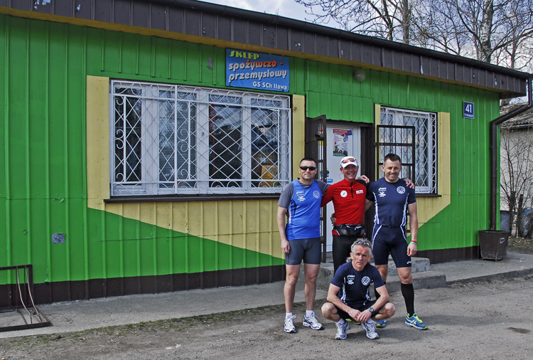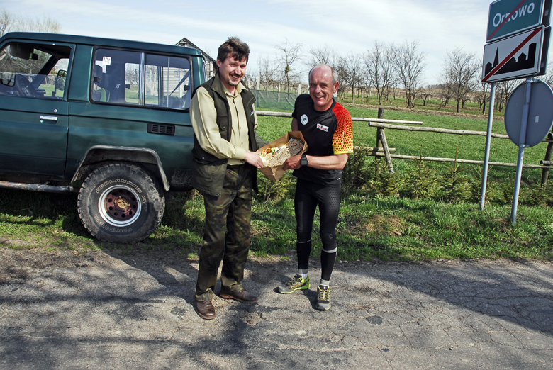 Po około siedemnastu kilometrach wspólnego biegu przyszła niestety pora rozstania. Ale skończyliśmy tak, jak zaczęliśmy, czyli pod lokalnym GS-em (!), gdzie zrobiliśmy sobie jeszcze pamiątkowe zdjęcia. Dalej pobiegł już ze mną tylko Zygmunt – leśnik z Iławy, który towarzyszył mi wczoraj, a dzisiaj przyłączył się do nas, gdzieś na 10 kilometrze. W sensie nawierzchni biegowej, zaliczyliśmy dzisiaj chyba wszystko, co możliwe, czyli najpierw asfalt z dziurami i gdzieniegdzie gładki, czyli taki bez dziur, potem twardy dukt leśny, a następnie delikatny masaż stóp po kocich łbach, by wreszcie wybiec na piaskową, polną drogę, gdzie przejeżdżający z rzadka samochód wzbijał tumany pyłu, niemal jak na Saharze. A słońce prażyło jak trzeba i na polach przez które biegliśmy później z Zygmuntem nie było po prostu gdzie się ukryć. Gdy w końcu wybiegłem – już samotnie – na krajową „16-tkę” podążając w kierunku Ostródy, terapia wspomnianego wcześniej „Szamana z Pasłęka” przestała jednak działać i moja lewa noga przypomniała o sobie. Musiałem mocno zwolnić i biec już tylko na śródstopiu. Na szczęście, przed Brzydowem, czekała na mnie Kamilla z Ostródy, która jakoś „doholowała” mnie do samego Ornowa, czyli opłotków Ostródy, gdzie nasze rodzime Nadleśnictwo Miłomłyn powitało nas z Grześkiem chlebem i solą… I to w sensie dosłownym! Oj, było nam bardzo miło, a ten chleb okazał się przepyszny! 😊 A jutro ostatni, normalnej długości etap „Mazury Tour 2013″, czyli 25 kilometrów. Później jeszcze tylko dwie „przebieżki” po 19 i 12 kilometrów i będzie już meta w Kudypach !