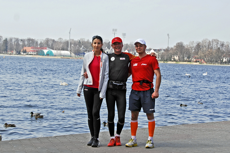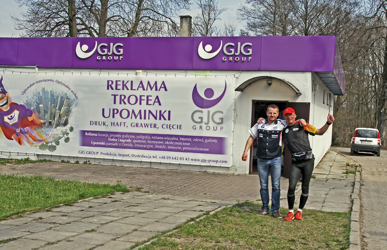 Tym razem, punktualnie o 13-tej rozpoczęliśmy bieg spod tablicy z nazwą miejscowości Ornowo, czyli dokładnie tam gdzie wczoraj skończyliśmy. Gdyby nie stan tutejszej, dziurawej jak sito drogi, to nie byłoby najgorzej, choć akurat ten fragment trasy do łatwych wcale nie należy, gdyż jest mocno pagórkowaty. Początkowo, biegliśmy we trójkę: Kamilla, Kamil i ja, ale po kilku kilometrach z powodu kontuzji, zostaliśmy na szosie już tylko z Kamilem. Mile sobie rozmawiając, między innymi o warszawskim Orlen Maratonie, który był dla Kamila jego debiutem na tym dystansie i to od razu bardzo udanym (3:59 !), dobiegliśmy dosyć szybko do Ostródy, która powitała nas pięknym słońcem i szybko rosnącą temperaturą. Zacząłem się nawet po raz pierwszy w trakcie „Mazury Tour 2013” martwić o to, czy nie będzie zbyt gorąco! 😊 I chwilami naprawdę było, ale na szczęście tylko chwilami, jak choćby wtedy gdy dobiegliśmy na ulicę Drwęcką, gdzie mieści się siedziba jednego z głównych sponsorów biegu dookoła Mazur, czyli firmy GJG Group, której sam szef we własnej osobie, powitał nas serdecznie przed siedzibą firmy, nie wierząc chyba przy tym własnym oczom, że… ja to naprawdę ja ! Czyli ten sam gość, który był tu po raz ostatni ponad 40 dni temu, zanim zdążył obiec te, całe Mazury. 😊 Chciałem jeszcze odwiedzić inne miejsce w Ostródzie na „Placu 1000-lecia”, ale Grzesiek naglił twierdząc, że i tak jesteśmy mocno spóźnieni, a dalsza cześć trasy, już za Ostródą, wcale do łatwych nie należy. Co było robić, więc ruszyliśmy z Kamilem grzecznie dalej.