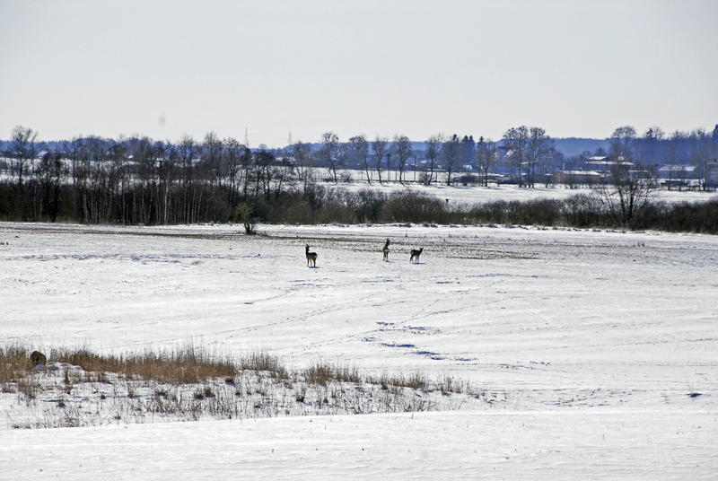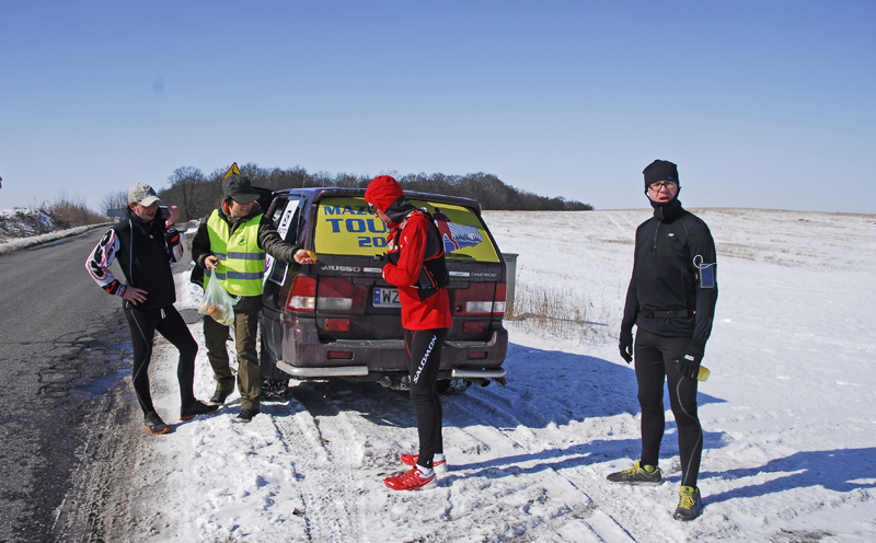 Zwalniałem, ale zaraz przyśpieszałem, bo było mi tak zimno, że myślałem tylko o tym, aby choć przez moment trochę się mocniej rozgrzać. Mimo to, kilka razy palce w rękawiczkach zmarzły mi do tego stopnia, że o mało nie wyłem z bólu ! Robiliśmy wprawdzie krótkie przerwy, ale to niewiele pomagało, bo po chwili, lodowaty wiatr nas dosłownie zamrażał ! W trakcie biegu, beznamiętnie obserwowałem pokryte grubym dywanem śniegu pola, zastanawiając się nad tym, czy ta wiosna w ogóle w tym roku przyjdzie ? Na szczęście, w okolicach Susza, wiatr nieco osłabł, na co wszyscy biegnący odetchnęli z wielką ulgą ! Nawet Grzesiek, bo jak wychodził z samochodu to lodowaty wiatr przewiewał go na wylot i nie był z tego powodu zbytnio zadowolony. Ale też dał radę, co oznacza, że jutro o 12-tej znowu biegnę dalej…