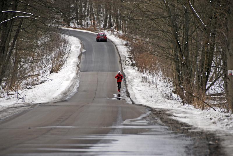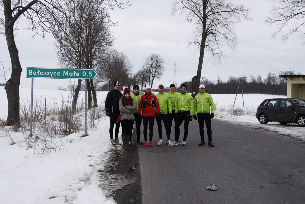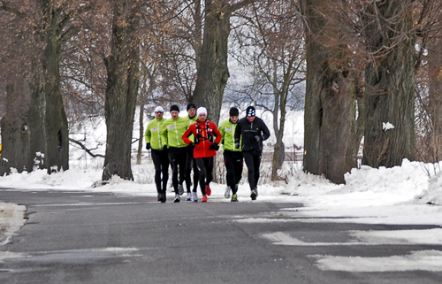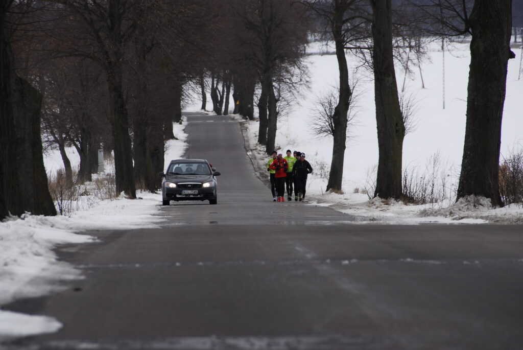 Ruszyliśmy w samo południe, w sile 7 chłopa i to… dobrze wytrenowanego chłopa”, bo złożonego z zawodników triatlonowego klubu UKS TRS Susz. Z początku jeszcze dość mocno wiało, więc… trochę dorzuciliśmy do pieca (czyli tak mocno poniżej 5 min/km), żeby się rozgrzać. Potem zwolniliśmy i tempo spadło do komfortowego dla mnie, czyli około 5:30 min/km. Mile sobie rozmawiając „łykaliśmy” kolejne kilometry.