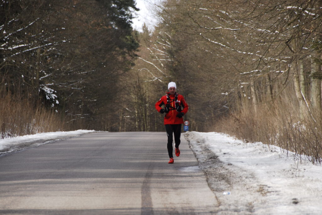 „Czarnowidztwo” się pogłębiało, im częściej przechodziłem do marszu, zastanawiając się nad tym, co robić dalej? Grzesiek, jako doświadczony maratończyk zorientował się błyskawicznie, co się dzieje i próbował mi jakoś pomóc. Nie chciałem jednak, ani nic jeść bo czułem się pełny, ani też pić bo już więcej nie mogłem i obawiałem się kolki. A do mety było jeszcze ok. 7-8 km i ciągle te podbiegi… Nagle zaczął mi ciążyć mój plecak, coś bolało pod lewym kolanem oraz w plecach. Nic mi się nie chciało! Nawet moje ulubione buty w których uwielbiam biegać, teraz zaczęły mi jakoś dziwnie przeszkadzać. W dodatku, ze zdenerwowania rozbolał mnie żołądek i zrobiło się naprawdę nieciekawie, bo nie miałem ze sobą żadnych środków przeciwbólowych. Gorączkowo myślałem co robić. Wtedy przypomniałem sobie zasadę „czterech kroków” Scotta Jurka, która brzmi mniej więcej tak: