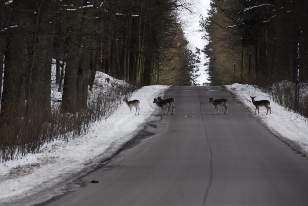 Rozmawialiśmy głównie o triatlonach (m.in. o tym w Suszu i o tym moim w Wińcu…), trochę o maratonach w ogóle i o „Mazury Tour 2013” także. Nawet nie zauważyłem, gdy przeleciało 12 km i czas było się żegnać, bo triatloniści mieli dzisiaj jeszcze w planie trening pływacki… (sic !). Na końcu miejscowości Kisielice zrobiliśmy sobie pamiątkowe zdjęcie i dalej podążyłem już sam. Zaraz za Kisielicami zaczęły się górki, o których mi wcześniej wspominali. Z początku łagodne, ale potem coraz trudniejsze. Po ósmym podbiegu, przestałem już je liczyć. Tym bardziej, że okolica drogi kierunku na Biskupiec była bardzo piękna – głęboki las po obu stronach drogi i prawie żadnego ruchu samochodowego. Tylko ja sam na szosie, a w zasięgu wzroku mój dzielny Grzesiek w samochodzie, uważnie obserwujący jak biegnę (tzn. żeby nie za szybko) i czy, aby czegoś właśnie nie potrzebuję oraz… dzika zwierzyna ! A konkretnie daniele, których małe stadko wyszło w pewnym momencie na szosę i się nam uważnie przypatrywało. W dodatku nic nie padało, wiatr osłabł i zaczęło nawet wychodzić słoneczko. A więc, używając słów klasyka, były to naprawdę… „piękne okoliczności przyrody” !