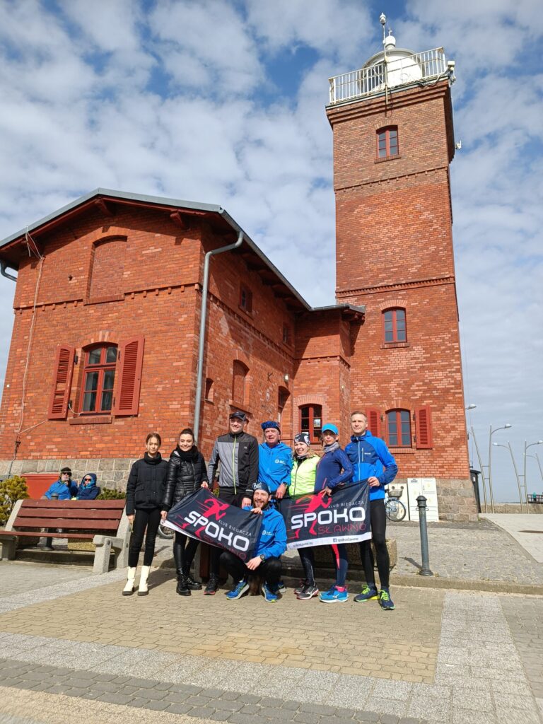 Błądząc nieco po lokalnych drogach i doradzanych przez mieszkańców „skrótach”, które często wzajemnie się wykluczały dotarliśmy do latarni morskiej (nr 6) w Darłowie „rozmieniając” pierwszą dyszkę w dniu dzisiejszym i gdzie czekali na nas kolejni, przemili biegacze ze Sławna. Od razu troskliwie się nami zajęli, pomagając na przykład w wykonaniu profesjonalnego opatrunku moich krwawiących palców prawej stopy. Potem poprowadzili nas cudowną, nadmorską drogą ciągnącą się przez wiele kilometrów wąskimi wydmami pomiędzy Bałtykiem, a jeziorem Kopań. Pomyślałem sobie wtedy, jak cudowne jest bieganie, bo pewnie gdyby nie ono, to nigdy bym tutaj nie dotarł i nie zobaczył tak pięknego miejsca nad polskim morzem. Nawet nie zauważyłem kiedy „pękła” druga dycha, a potem już prawie byliśmy w domu. 😊 Po drodze w miejscowości Wicie, osiągnęliśmy geograficzny środek polskiego wybrzeża (262 km), co uwieczniliśmy pamiątkowymi zdjęciami. Stamtąd do naszej, kolejnej latarni morskiej (nr 7) w Jarosławcu było już tylko ok. 6-7 km. Niby niewiele, ale ja zacząłem już odczuwać syndrom „30-go kilometra” maratonu. Reszta mojej energii zaczęła ulatniać się w błyskawicznym tempie, co obserwowałem na swoim zegarku Garmin-a, który z minuty na minutę pokazywał dramatycznie szybkie wyczerpywanie się pozostałego mi zasobu energii. Skąd ja to wiedziałem?