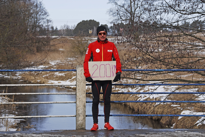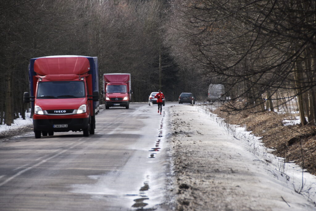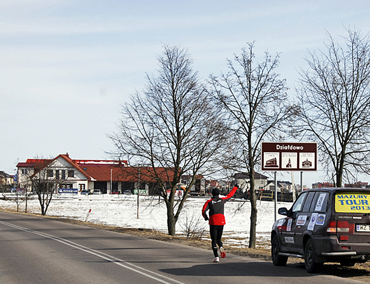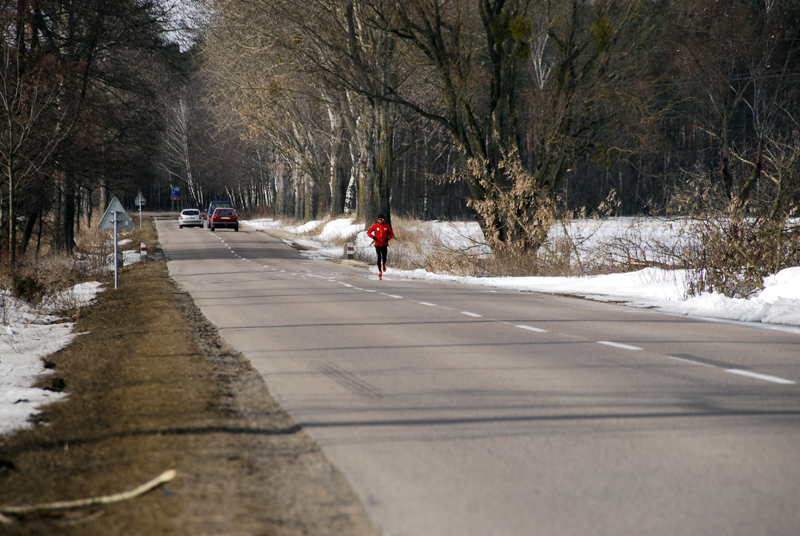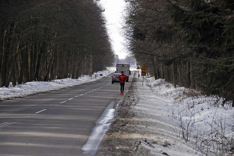 Na maratonach jest nieco inaczej, bo zawsze można się za kimś schować (tzw.drafting), z czego zwykle chętnie korzystam bo jestem biegaczem raczej wat postury i zawsze biegnie obok mnie ktoś potężniejszy, za kogo mogę się schować (jak na przykład podczas maratonu nowojorskiego na moście Queensboro, gdzie wiało też niemiłosiernie i schowałem się za dwoma rosłymi Norwegami :). Dzisiaj natomiast na szosie Lidzbark – Działdowo byłem sam jak palec, w dodatku lasów było jak na lekarstwo. Wszędzie otwarte pola, gdzie hulało, aż w głowie bolało… Na bieżąco analizowałem sytuację, ale nie mogłem nic zrobić. Mogłem co najwyżej przerwać bieg, albo ciągnąć dalej (pierwsza opcja nie wchodziła w rachubę). Na szczęście mazurskich gór już nie było, pokonywałem tylko jakieś nic nieznaczące „pagórki” z kilkusetmetrowymi podbiegami. Biegłem non stop w okularach, ale nie dlatego, że było jakieś silne słońce, tylko po to, żeby chronić oczy przed tym morderczym wiatrem oraz powiewami pyłu z szosy, który podnosiły przejeżdżające co chwila ciężarówki.