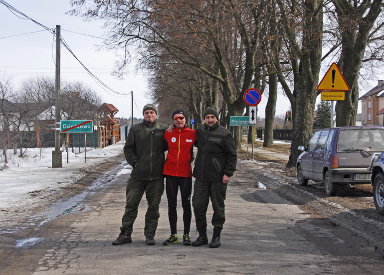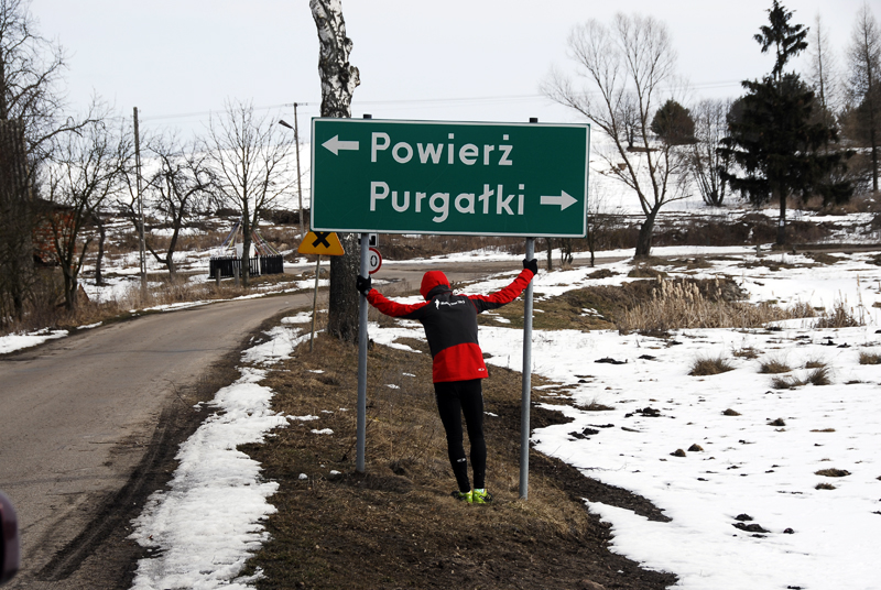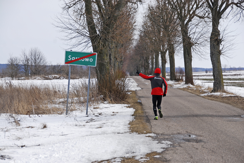 Dokładnie w samo południe ruszyliśmy, prowadzeni przez samochód uczynnych leśników z Leśnictwa Filice. Asfalt skończył się już po dwóch pieszych kilometrach i zaczął się regularny, mazurski off-road. Jak dobrze, że zmieniłem buty! Biegłem po miejscami całkowicie rozmiękniętej polnej drodze, która prowadziła chyba donikąd… Tak mi się przynajmniej wydawało. Zaliczałem na tej drodze wszystko, co tylko było – kałuże, rozmiękniętą glinę, śnieg i lód ! Przeskakiwałem koleiny, ślizgałem się raz na lodzie, a innym razem na rozmiękniętej glinie. Kilkakrotnie musiałem obchodzić niektóre miejsca zagonami pobliskiego pola. Kiedy po 5km takiego hardcore’u dotarłem wreszcie do miejscowości Sarnowo, gdzie ponownie zaczynał się asfalt, byłem już „ugotowany”. A to miał być dopiero początek, moich, dzisiejszych zmagań ! Oto bowiem za wspomnianym Sarnowem zaczęły się otwarte, szczere pola, gdzie wiało niemiłosiernie (w porywach ponad 40 km/godzinę!). Chwilami wiatr mnie prawie zatrzymywał. Grzesiek był przerażony i chyba naprawdę mi współczuł. Po godzinie biegu w takich warunkach, zaczęły mnie boleć nogi. Ale dosłownie wszędzie !