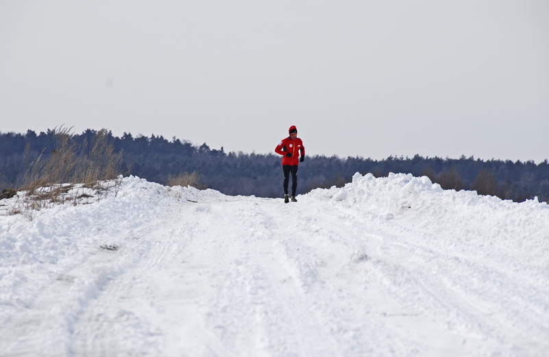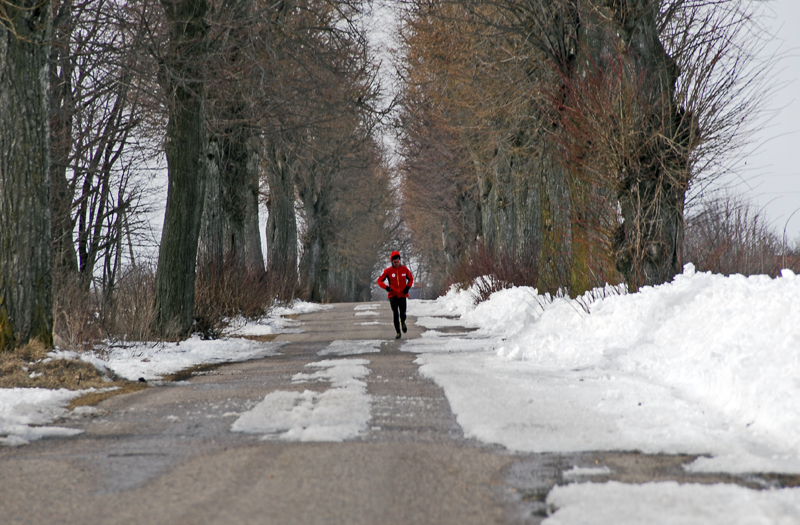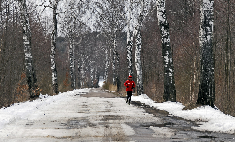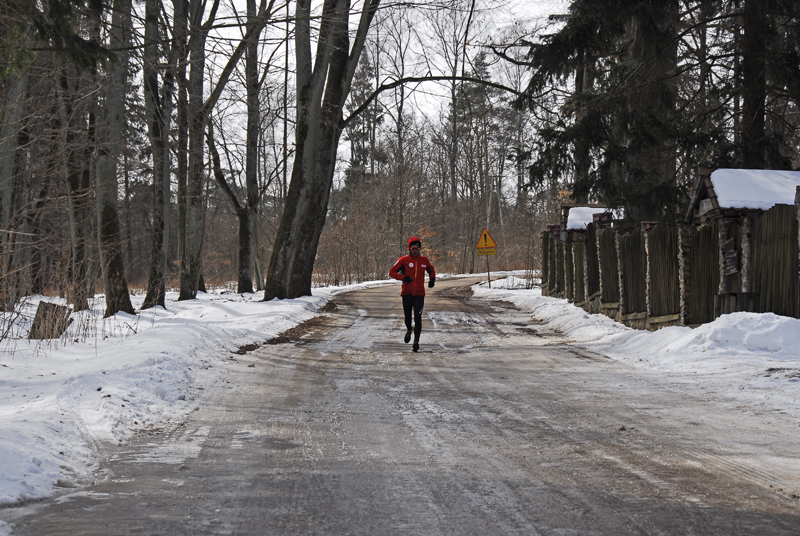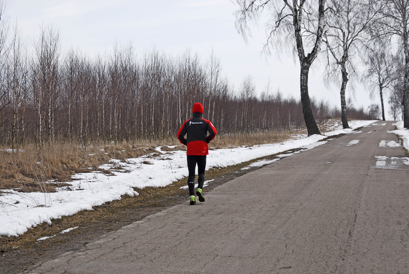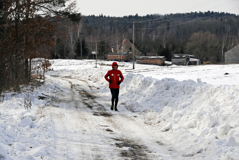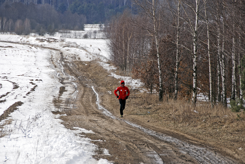Asfalt skończył się już po dwóch pierwszych kilometrach i zaczął się regularny, mazurski off-road. Jak dobrze, że zmieniłem buty! Biegłem po miejscami rozmiękniętej polnej drodze, która prowadziła chyba do nikąd… Tak mi się przynajmniej wydawało. Zaliczałem na tej drodze wszystko, co tylko było – kałuże, rozmiękniętą glinę, śnieg i lód! Przeskakiwałem koleiny, ślizgałem się raz na lodzie, a innym razem na rozmiękniętej